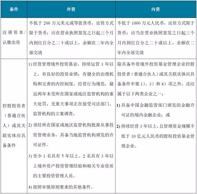 根据《深圳QDIE试点办法》,符合条件的内资或外资机构均可参与QDIE试点资格的申请,但对外资和内资机构的要求条件有所不同(主要条件如下表所示)。不过,据我们了解,截至目前成功获得试点资格的机构(“QDIE机构”)主要集中在境内金融企业的下属单位(例如,南方基金旗下的南方资本管理有限公司、长城证券旗下的长城富浩基金管理有限公司,中诚信托旗下的深圳前海中诚股权投资基金管理有限公司等)。