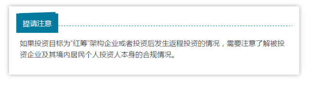 (2) 境内机构境外投资后发生返程投资的情况 这种情况下,在境内企业境外投资备案/登记时,需要向相关政府部门披露最终投资目标公司,如果确定是“红筹”架构,则会出现上段描述情况,有可能不能获得相关备案/登记;如果不是(至少投资时不是)“红筹”架构,则境内企业境外投资登记/备案本身应该能够通过且没有法律问题,只是日后如果发生返程投资时(例如境外公司回到中国境内设立外商独资企业或合资企业),主管机关(即外管局)在办理中国企业外汇登记证或者办理增资时,一般会核查中国企业的境外最终的投资人中,是否有境内居民个人或机构,如有,可能被要求提供相关的37号文等合法备案/登记证明;如没有,则会要求中国企业就其境外投资人中没有境内居民个人及机构做出书面承诺。