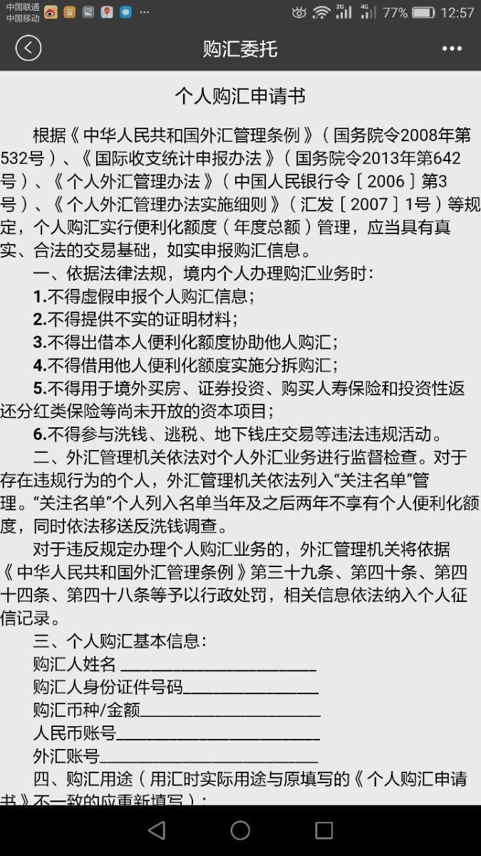 虽然2017年居民5万美元购汇额度并未缩减,但却迎来了更复杂的购汇流程,以及更严格的购汇用途监管。 2017年伊始,第一财经记者发现,无论是手机网银、网点自助购汇机还是网点柜台购汇时,都需要先填写一份《个人购汇申请书》(下称《申请书》)。 在个人客户购买外汇时,需要填写《申请书》。申请书上明确,“境内个人办理购汇时,不得用于境外买房、证券投资、购买人寿保险和投资性返还分红类保险等尚未开放的资本项目。违者将列入‘关注名单’,当年及之后两年不享有个人便利化额度”。 选项更详尽 虽然2017年居民每人5万美元购汇额度并未缩减,但是从昨日起,居民购汇流程相比以往更加复杂。 相比以往在手机银行或网点自助购汇机上随意勾选购汇用途即可使用5万购汇额度购汇,《申请书》对个人购汇用途进行了更详细的调查,分因私旅游、境外留学、公务及商务出国、探亲、境外就医、货物贸易、非投资类保险、咨询服务以及其他共9大项。每个大项后面还跟着三四条子项。例如因私旅游大项就包含了”预计进外停留期限,目的地国家、地区”两个子项。最多的境外留学大项,包含了“学校民称、留学国家、地区,年学费币种、金额,年生活费币种、金额”四个子项。